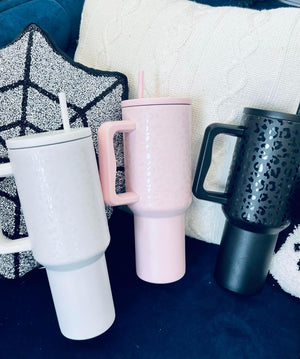 These are completely leak and spill proof! They have matching straws, twist top and ergonomic curved handle!! They are 40oz!