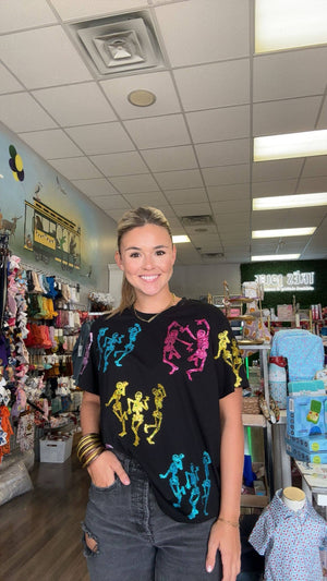 Turn heads and raise spirits in this bold and spooky-chic colorful sequin skeleton T-shirt! Set against a classic black background, this statement piece features a full skeleton design made entirely of shimmering, multicolor sequins that catch the light with every move. Whether you're dancing the night away, celebrating spooky season, or just showing off your undead drip, this tee is equal parts creepy and fabulous. ✨